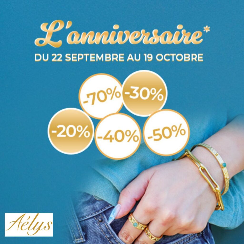 Du 22 septembre au 19 octobre, votre magasins Aélys fête son Anniversaire avec des promotions exceptionnelles sur une large sélection de bijoux et montres.