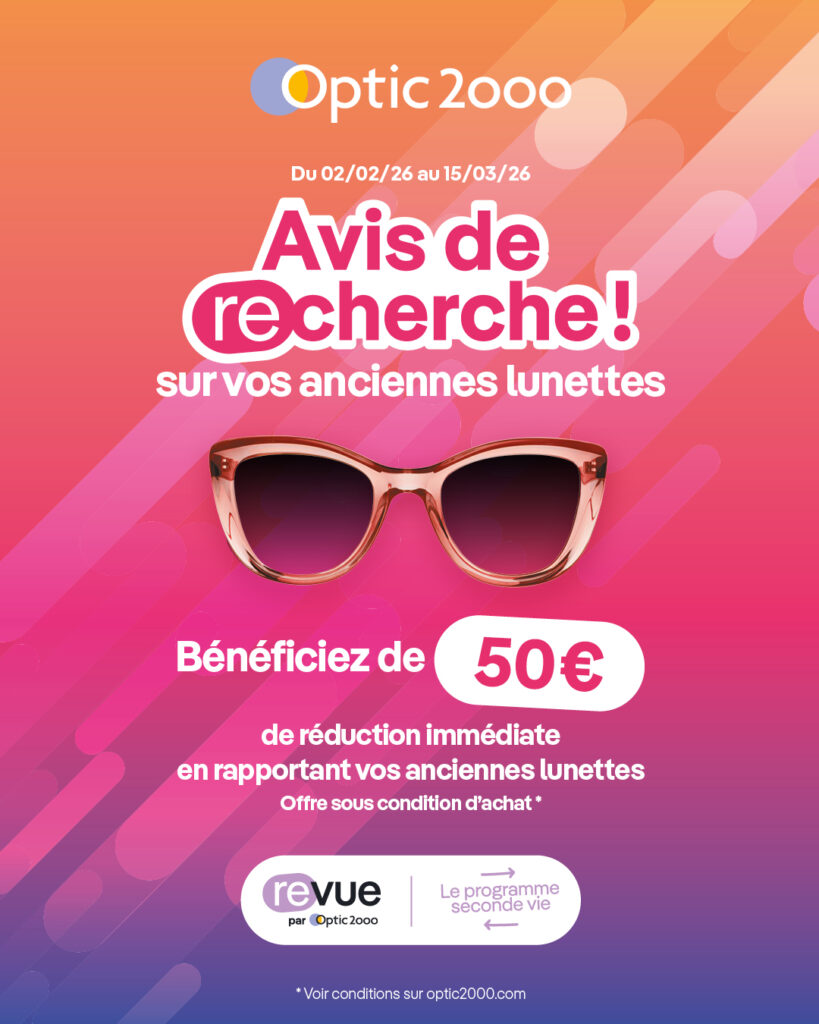 Du 2 février au 15 mars 2026, Optic 2000 lance son opération “Avis de recherche” et vous propose de bénéficier de 50€ de réduction immédiate en rapportant vos anciennes lunettes.
