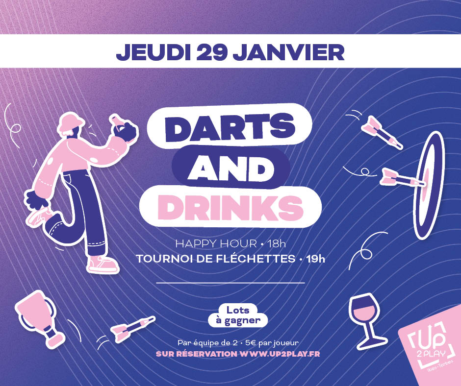 UP2PLAY Tarbes-Ibos vous donne rendez-vous le jeudi 29 janvier pour une soirée conviviale et festive autour d’un tournoi de fléchettes Darts & Drinks.